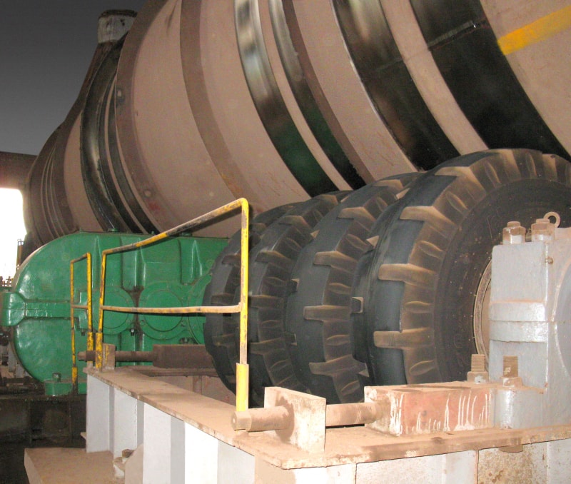 16.00-25規(guī)格海綿實(shí)芯輪胎配套在日照鋼鐵有限公司3.4米x14米混料機(jī)上